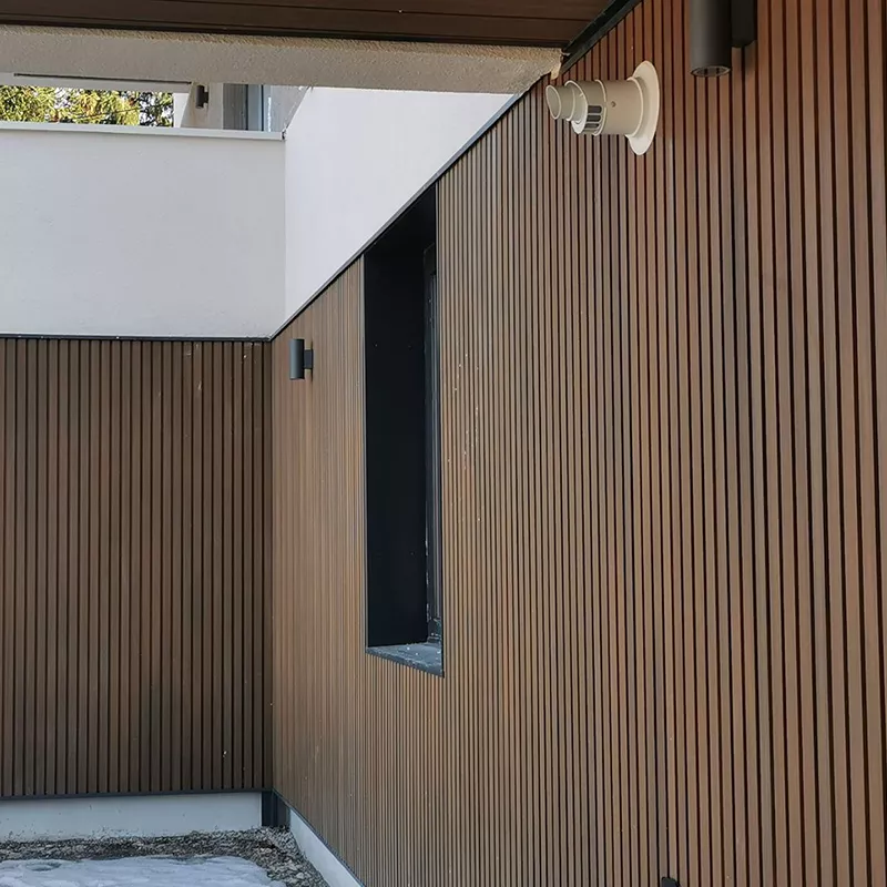 Es un piso tipo Deck en madera sintética WPC, ideal para exteriores con un muy bajo costo de mantenimiento y una garantía directa de 10 años.
